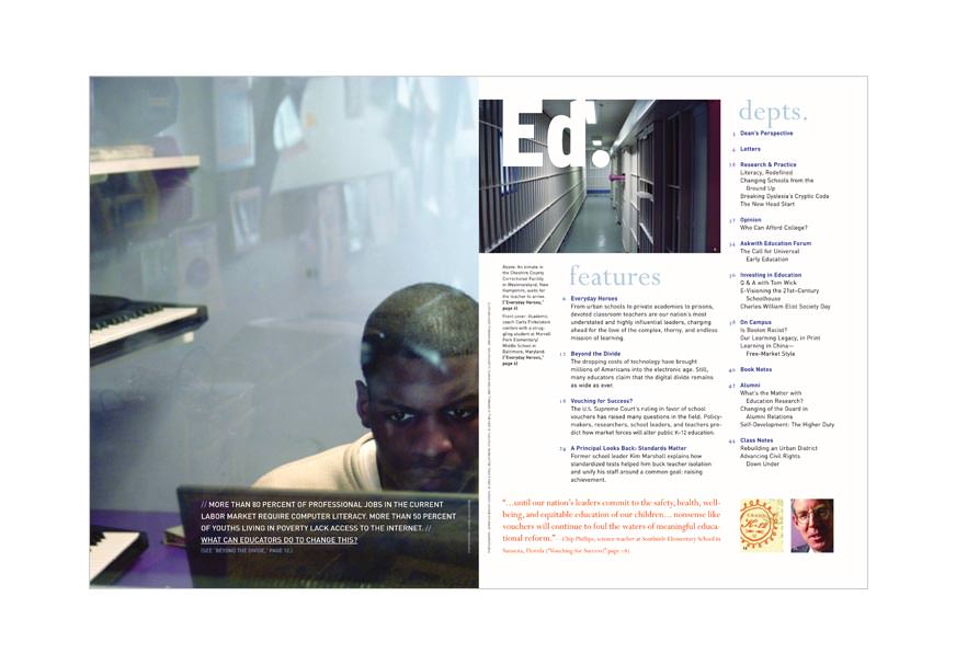 The redesign of Ed. magazine for the Harvard Graduate School of Education was selected by the Society of Publication Designers (SPD) for the SPD 37 Annual. As part of the redesign, Visual Dialogue re-named the publication from the wordy and academic-sounding “Harvard Education Bulletin” to the bolder and more contemporary “Ed.” The copy, layout, photography, and illustration all work together to engage and interest readers. Chosen from over 7,500 submissions, the design of the alumni magazine reflects the leadership role of the Ed School in the field and it’s real-world impact. The SPD annual is the most prestigous design competition in magazine publishing— previous winners include Esquire, Fast Company, and The New York Times Magazine.