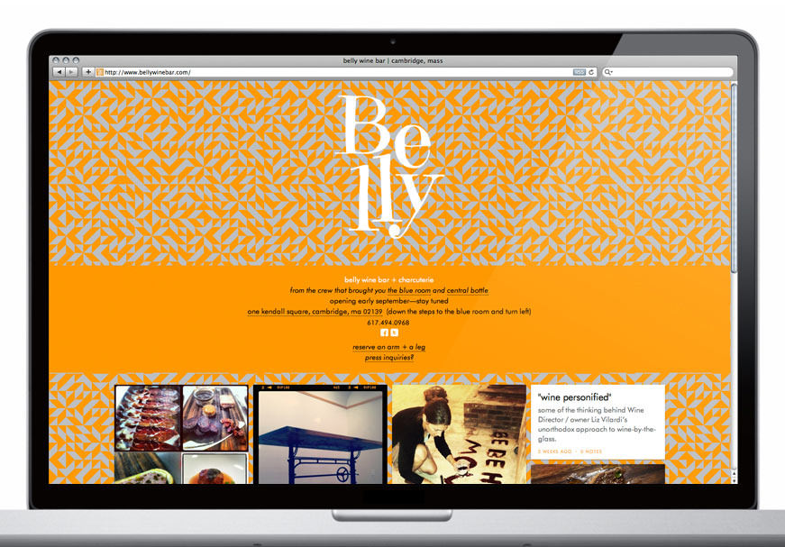 From the folks behind The Blue Room and Central Bottle comes a new wine bar in Kendall Square called Belly. Visual Dialogue created the brand identity—logo, signage, menus, and website—which combines a hand-made aesthetic with a geometric pattern and bold color palette. Think of the branding as a wine label for Belly… it gets your attention and tells you a bit about what’s inside. But you really need to taste it for yourself.