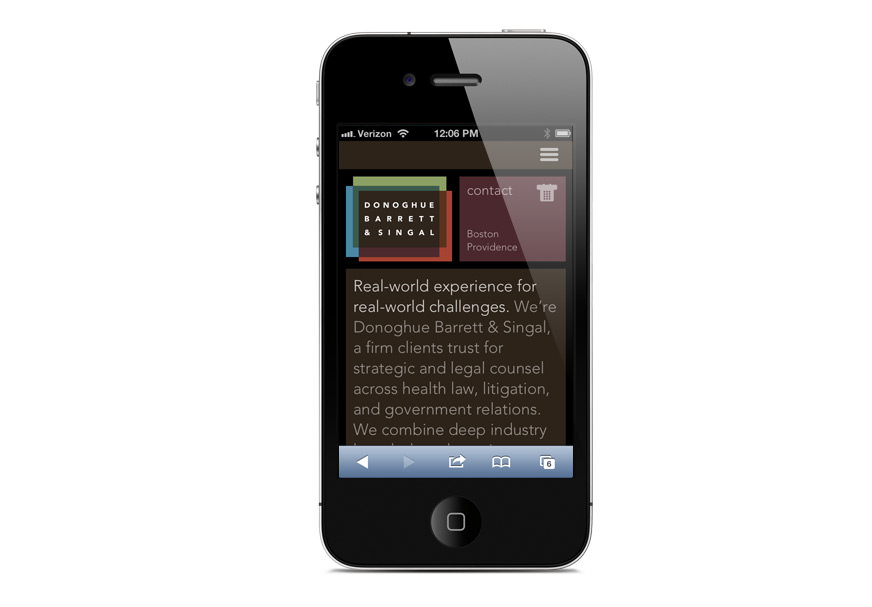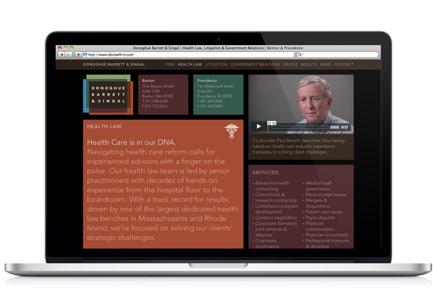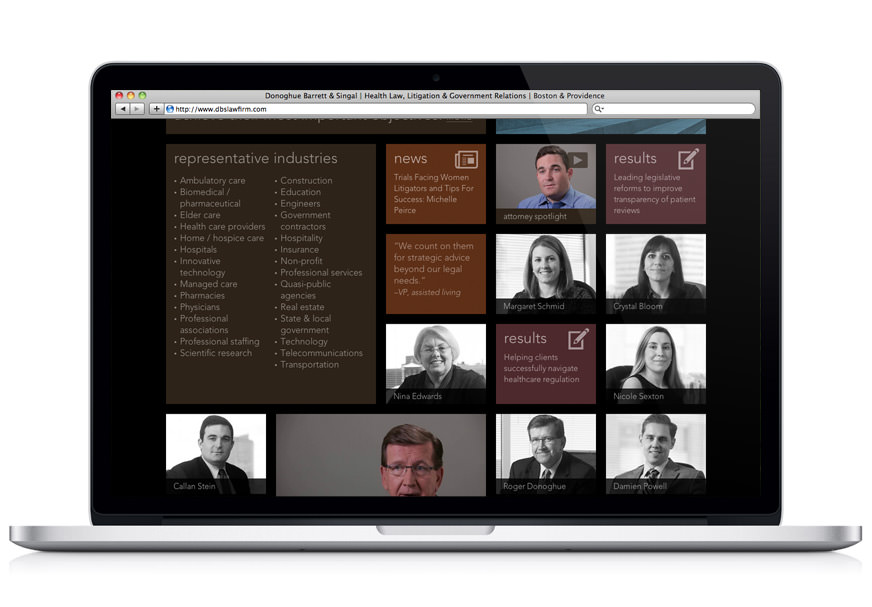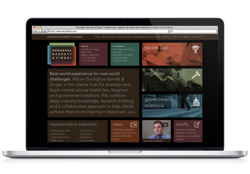 When you think of a law firm, “personal” and “collaborative” aren’t the first words that come to mind. But those were the key insights that inspired our website redesign and brand identity for Donoghue Barrett & Singal. The responsive site features attorney photos and videos that put a face on the firm and introduce the people you want on your side.